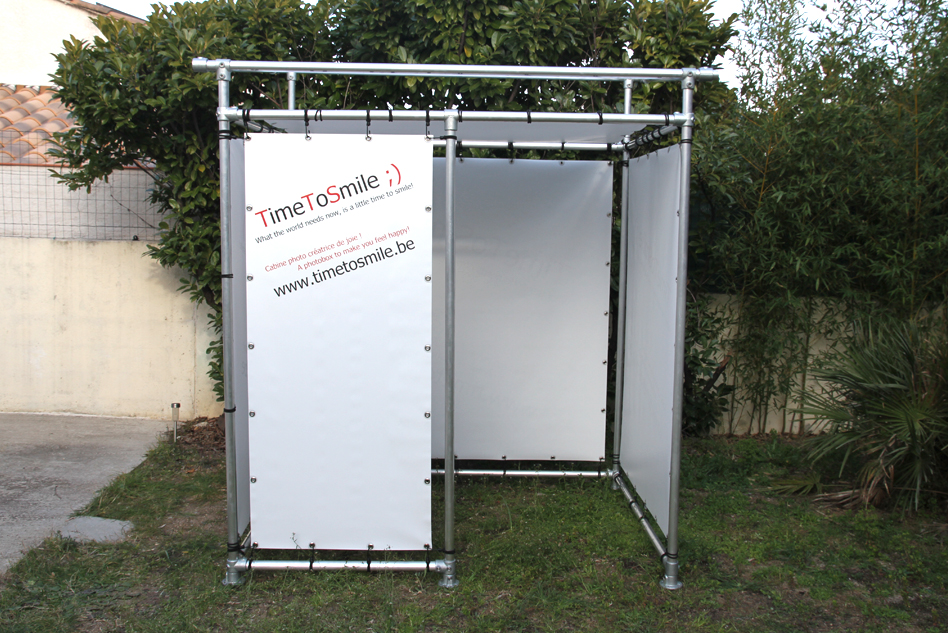 Photos du projet de cube promotionnel réalisé pour la marque TimeToSmile, dans le cadre d'un évènement. Utilisation du modèle So-Cube sur mesure avec bâche tendue en pvc 500gr. Temps de montage : 40 min.